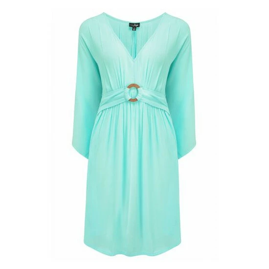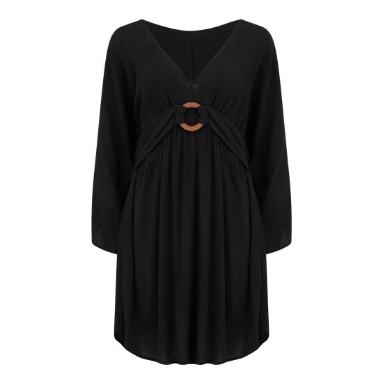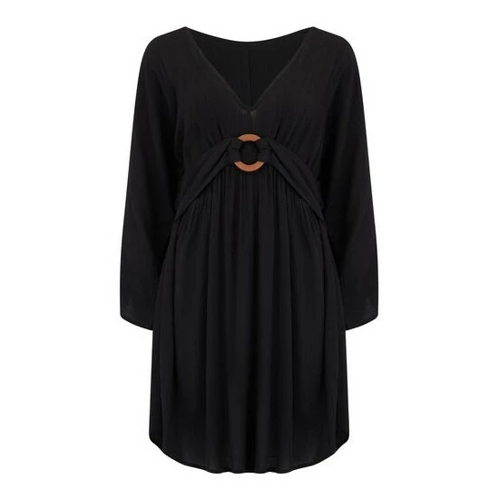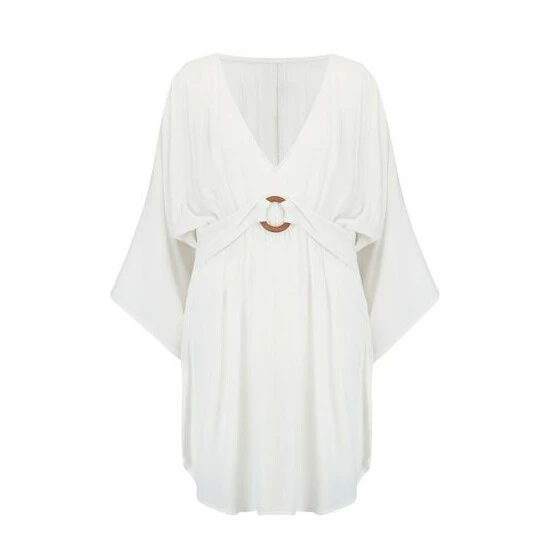 Wooden ring detail. Crinkle fabric. Elasticated waist 3/4 sleeves. V Neckline. Get beach ready in our Crinkle Ring Detail Cover Up. Perfect for a stroll along the beach or even a garden party, this style is made from lightweight fabric that s fitted around the waist with a wooden ring detail. With an elasticated waist, 3/4 sleeves and a flattering V Neckline, you ll be the best dressed babe on the beach this summer! And what s even better, is that you won t need to iron it!
