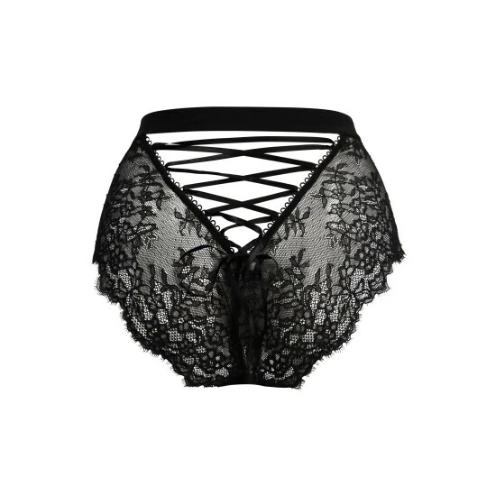 Super high waist deep brief V shape lace up back Floral eyelash lace and fishnet contrasting panel detail Good tummy coverage Full lace back Elasticated waistband Velvet bow detail at front.