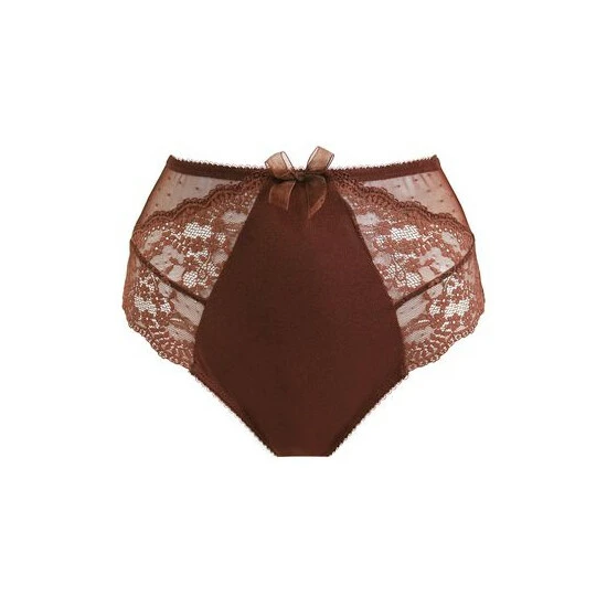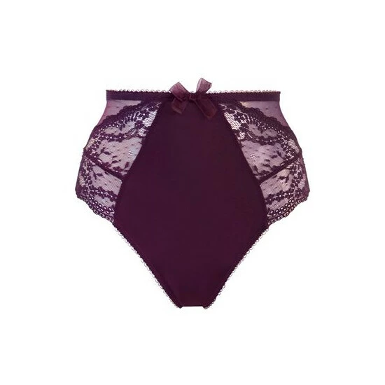 A deep style brief for full coverage. High-waisted. Side lace panels. Scalloped edging. Soft elasticated waistband. Pretty spot mesh detail on sides. Delicate Flora bow on front.