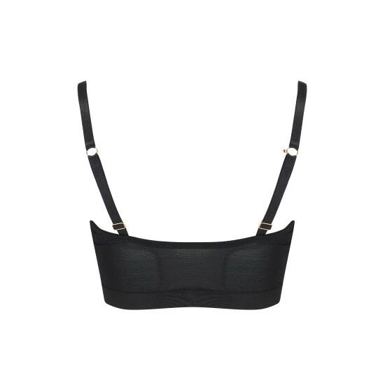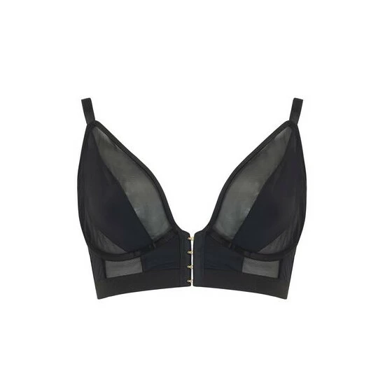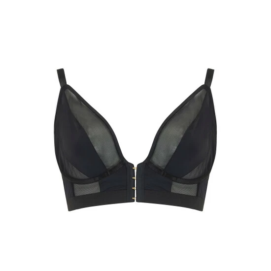 Underwired Non padded Longline shape Fully adjustable straps Front fastening with luxe gold hook and eyes A mix of soft microfibre and mesh fabric for an on trend mesh panelling design.