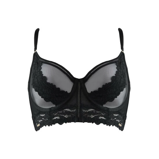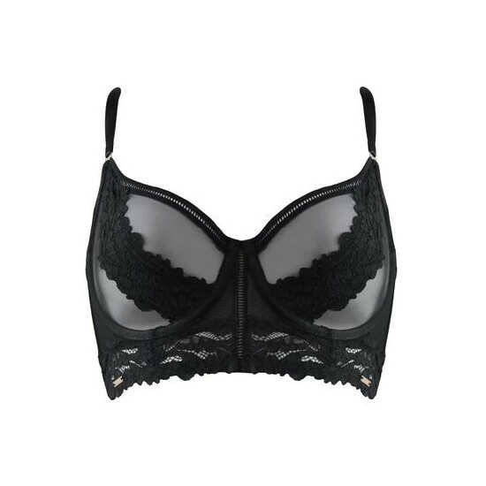 Underwired Non padded Longline bustier shape Fully adjustable straps On trend semi-sheer mesh cups Decorative embroidery panels over cups and underband with ladder detailDeep band with back hook and eye fastening Luxe gold hardware on straps A must-have item in everyone’s lingerie collection, the India Lace and Mesh Underwired Bustier will be the answer to all your style dilemmas. This longline, non padded style looks great under your clothes or paired with your favourite jeans and blazer. With fully adjustable straps this semi sheer bustier with decorative embroidery brings comfort and style to do your overall look. Finished sweetly with luxe gold hardware and hook fastening. For a beautiful lingerie set, pair with the India Lace and Mesh Thong and Suspender.
