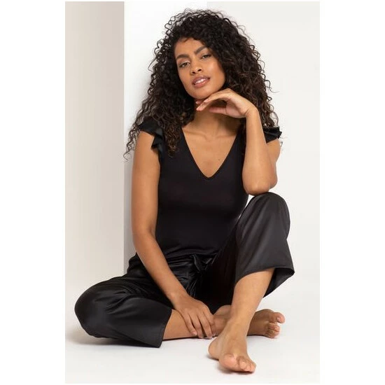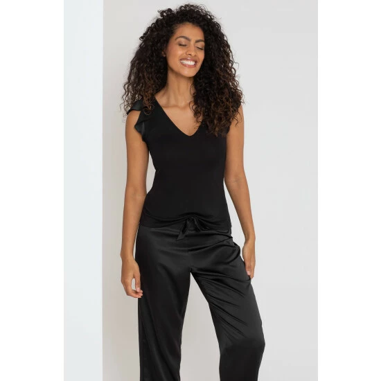 Make a comfortable and stylish addition to your nightwear collection with the Jersey and Satin Mix Frill Pyjama Set. This luxurious set is made with a fabric mix, with a soft jersey top and luxe satin trouser for a match made in slumber heaven. Drift off in style with this comfy set with frill sleeve details and satin faux tie waistband.