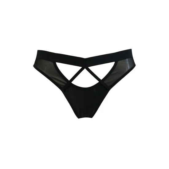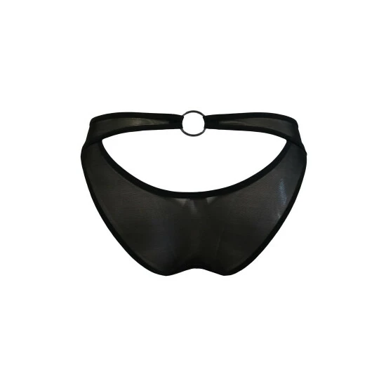 High leg brief shape Luxe satin fabric on front panel Cheeky cut out back and front keyhole Strapping detailing into ring feature on both front and back Cheeky cut out detail on front and back Full mesh back with cut out into ring detail Wide elasticated waistband.