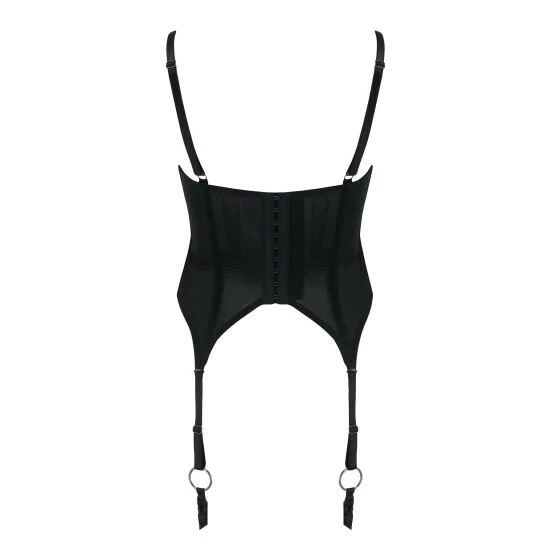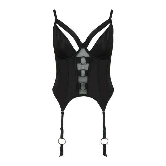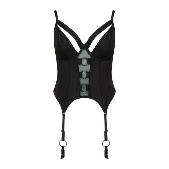 Underwired Non padded cups Strapping feature over cups into apex s Luxe satin fabric with soft power mesh panels on back Wide strapping ring feature up front of basque with mesh liner behind V point suspender detail with fully adjustable ring suspenders Fully adjustable straps Hook and eye fastening at back.