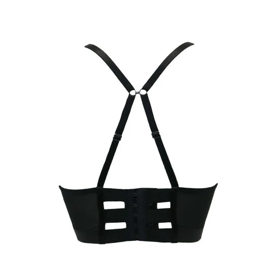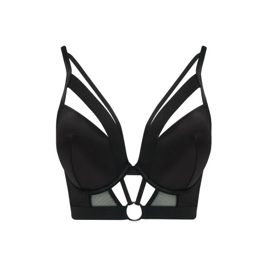 Underwired Padded push up bra Longline shape Luxe satin fabric Strapping feature over cups into apex s Mesh panelling with strapping details into Ring at front Wide elasticated strapping on underband into a caged back feature Partially adjustable straps with J hook for racer back option 5 hook and eye fastening at back.