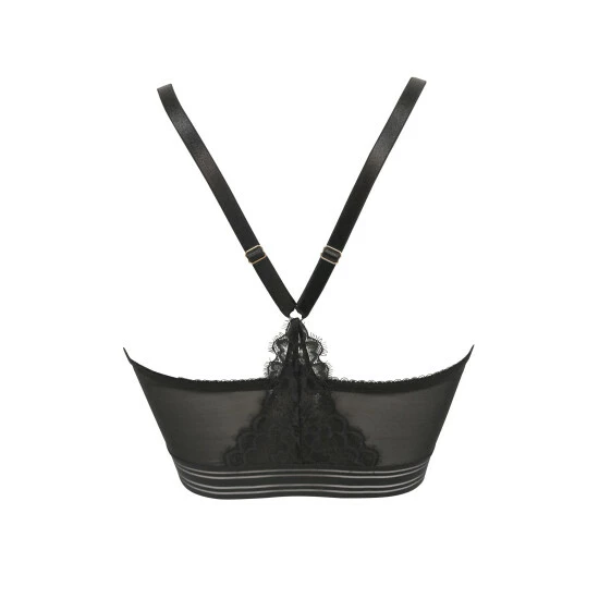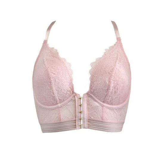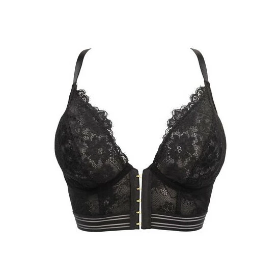 Underwired Non Padded Longline shape Racerback shape with pretty lace detail on back Fully adjustable straps Front fastening hook and eyes Luxe gold hardware A mix of detailed floral eyelash lace and mesh fabrics On trend Racer stripe underband feature.