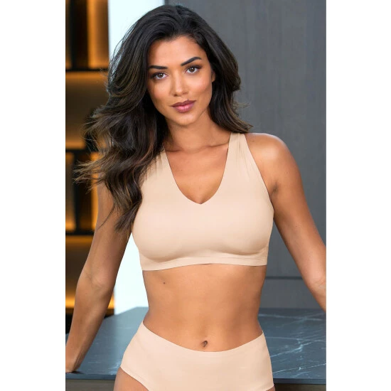 Non Wired. Removable moulded cups. Bralette shape.Super soft, smooth cool touch fabric. Bonded seamfree edges. Bonded panels within the bra to create gentle support. Racer back styling with V neck and back.